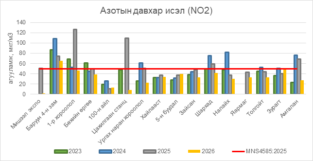 Азотын давхар исэл (NO2) нь Баруун 4-н зам орчим АЧС-аас 15 мкг/м3 –ээр их, бусад цэгүүдэд MNS 4585:2025 АЧС-аас даваагүй байна.