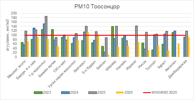 РМ10 тоосонцор нь Хайлааст орчим АЧС-аас 14 мкг/м3 –ээр их, 5-н буудал орчим АЧС-аас 2 мкг/м3 –ээр их, бусад цэгүүдэд MNS 4585:2025 АЧС-аас даваагүй байна.