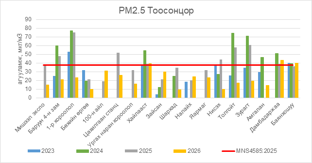 РМ2.5 тоосонцор нь Хайлааст орчим АЧС-аас 1.5 мкг/м3 –ээр их, Дамбадаржаа орчим АЧС-аас 5.5 мкг/м3 –ээр их, Баянхошуу орчим АЧС-аас 2.5 мкг/м3 –ээр их, бусад цэгүүдэд MNS 4585:2025 АЧС-аас даваагүй байна.