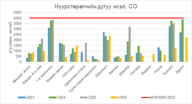 Нүүрстөрөгчийн дутуу исэл (СО) нь бүх цэгүүдэд MNS 4585:2025 АЧС-аас даваагүй байна.
