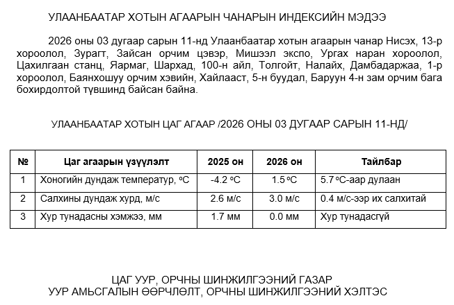 УЛААНБААТАР ХОТЫН АГААРЫН ЧАНАРЫН ХЯНАЛТ ШИНЖИЛГЭЭНИЙ ХОНОГИЙН МЭДЭЭ /2026.03.11/