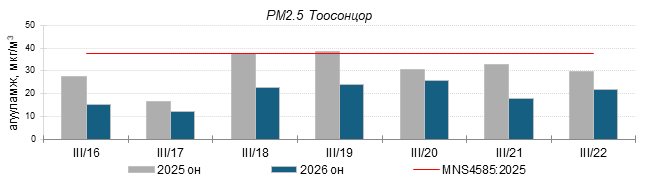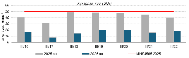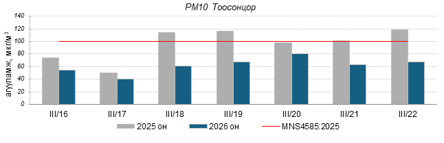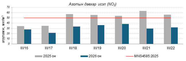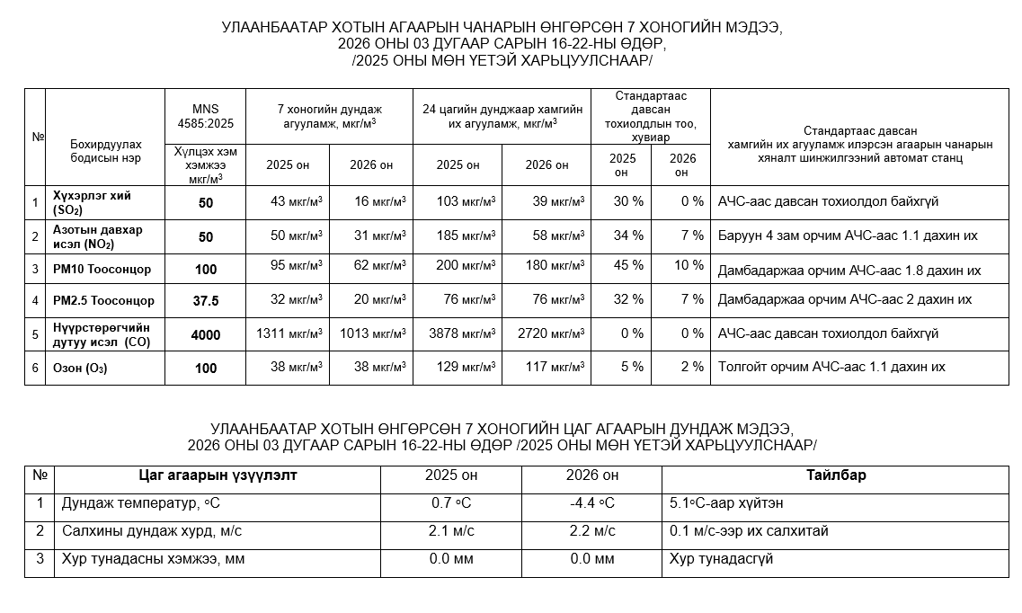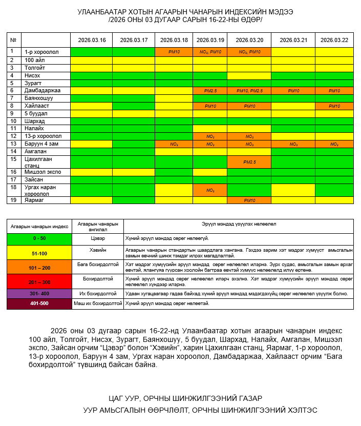 Улаанбаатар хотын агаарт түгээмэл бохирдуулах бодис хүхэрлэг хий /SO2/, азотын давхар исэл /NO2/, тоосонцор /PM10, PM2.5/, нүүрстөрөгчийн дутуу исэл /CO/, озон /O3/-ны агууламжийг тодорхойллоо.