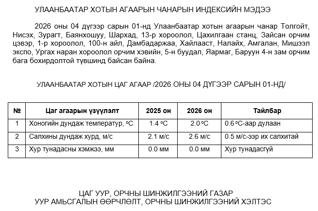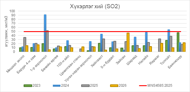 2026 оны 04 дүгээр сарын 01-ний байдлаар хүхэрлэг хий (SO2) нь бүх цэгүүдэд MNS 4585:2025 АЧС-аас даваагүй байна.
