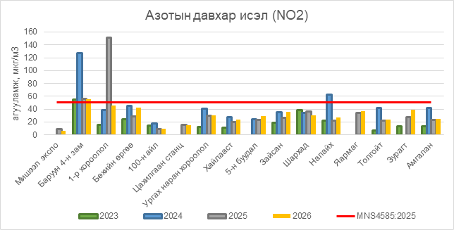 Азотын давхар исэл (NO2) нь Баруун 4-н зам орчим АЧС-аас 6 мкг/м3 –ээр их, бусад цэгүүдэд MNS 4585:2025 АЧС-аас даваагүй байна.