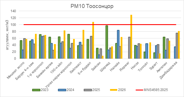 РМ10 тоосонцор нь 5-н буудал орчим АЧС-аас 8 мкг/м3 –ээр их, Яармаг орчим АЧС-аас 29 мкг/м3 –ээр их, бусад цэгүүдэд MNS 4585:2025 АЧС-аас даваагүй байна.
