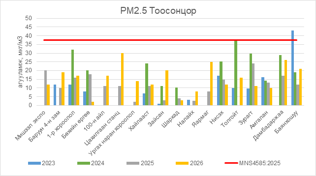 РМ2.5 тоосонцор нь бүх цэгүүдэд MNS 4585:2025 АЧС-аас даваагүй байна.