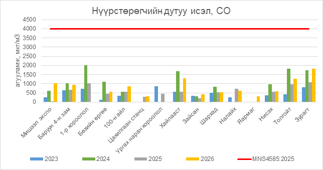Нүүрстөрөгчийн дутуу исэл (СО) нь бүх цэгүүдэд MNS 4585:2025 АЧС-аас даваагүй байна.