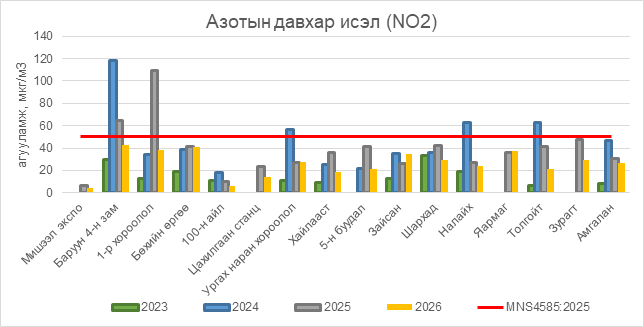 Азотын давхар исэл (NO2) нь бүх цэгүүдэд MNS 4585:2025 АЧС-аас даваагүй байна.