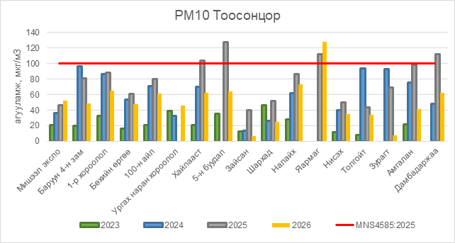 РМ10 тоосонцор нь Яармаг орчим АЧС-аас 28 мкг/м3 –ээр их, бусад цэгүүдэд MNS 4585:2025 АЧС-аас даваагүй байна.