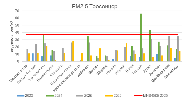 РМ2.5 тоосонцор нь бүх цэгүүдэд MNS 4585:2025 АЧС-аас даваагүй байна.