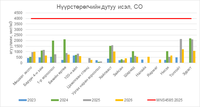 Нүүрстөрөгчийн дутуу исэл (СО) нь бүх цэгүүдэд MNS 4585:2025 АЧС-аас даваагүй байна.