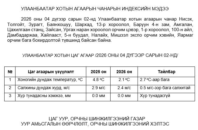 УЛААНБААТАР ХОТЫН АГААРЫН ЧАНАРЫН ХЯНАЛТ ШИНЖИЛГЭЭНИЙ ХОНОГИЙН МЭДЭЭ /2026.04.02/