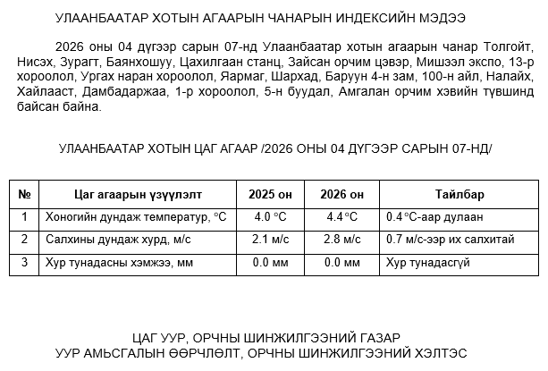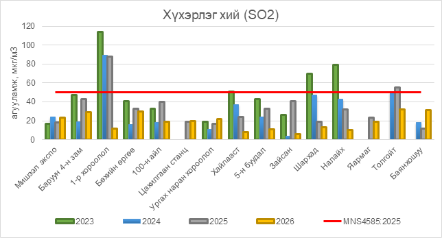 2026 оны 04 дүгээр сарын 07-ны байдлаар хүхэрлэг хий (SO2) нь бүх цэгүүдэд MNS 4585:2025 АЧС-аас даваагүй байна.