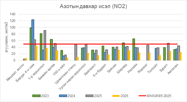 Азотын давхар исэл (NO2) нь бүх цэгүүдэд MNS 4585:2025 АЧС-аас даваагүй байна.