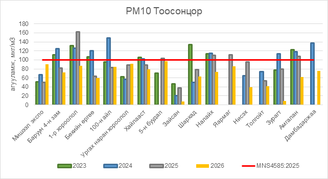 РМ10 тоосонцор нь бүх цэгүүдэд MNS 4585:2025 АЧС-аас даваагүй байна.