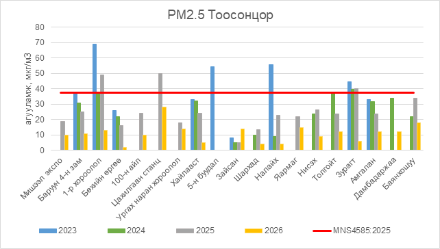 РМ2.5 тоосонцор нь бүх цэгүүдэд MNS 4585:2025 АЧС-аас даваагүй байна.