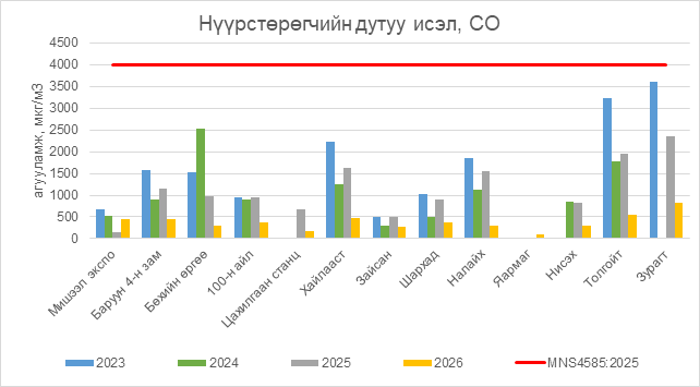 Нүүрстөрөгчийн дутуу исэл (СО) нь бүх цэгүүдэд MNS 4585:2025 АЧС-аас даваагүй байна.