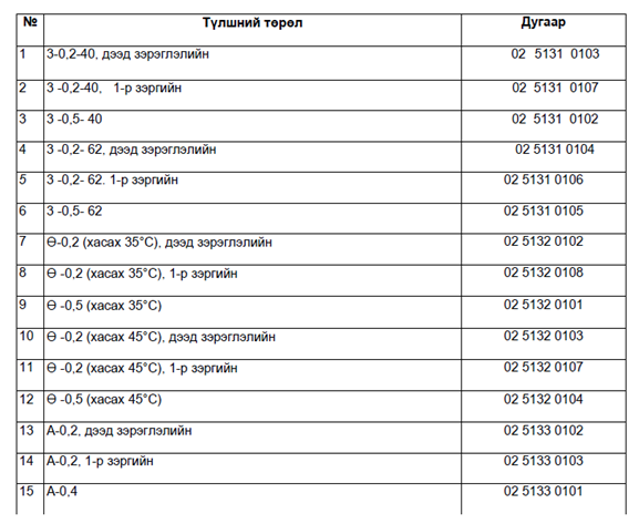 5.2 Захиалагч буюу хэрэглэгчтэй тохиролцон 40-өөс багагүй цетаны тоо бүхий өвлийн дизелийн түлш -Ө (царцах температур нь хасах 45°С) болон хэт хүйтэн бүсэд хэрэглэх дизелийн түлш (А)-ийг үйлдвэрлэн нийлүүлж болно.