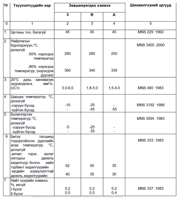 5.8 Дээд зэрэглэлийн 3, Ө, А төрлийн дизелийн түлшний үзүүлэлтүүдийн хэмжээ доор заасан шаардлага, нормыг хангасан байх ёстой. Үүнд: