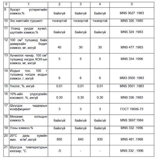 5.9 Хэрэглэгчтэй тохиролцсоны дагуу тухайн түлшийг хэрэглэх бүс нутгийн орчны агаарын температур 5°С-аас дээш үед 0°С-аас доош царцах температуртай, (булингартах температур нь нормчлогдоогүй) мөрийн төдий устай (дээд зэрэглэлийн түлшинд мөрийн төдий ус байхгүй байвал зохино) зуны дизелийн түлш (3)-ийг үйлдвэрлэн хэрэглэхийг зөвшөөрнө.