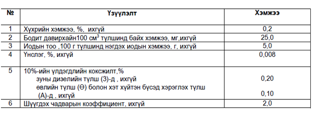 5.1 Дизелийн түлшний физик-химийн үзүүлэлтүүд 2-р хүснэгтэд заасан хэмжээ, шаардлагад тохирсон байна.