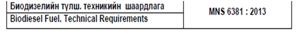 “Биодизелийн түлш” техникийн шаардлага монгол улсын стандарт