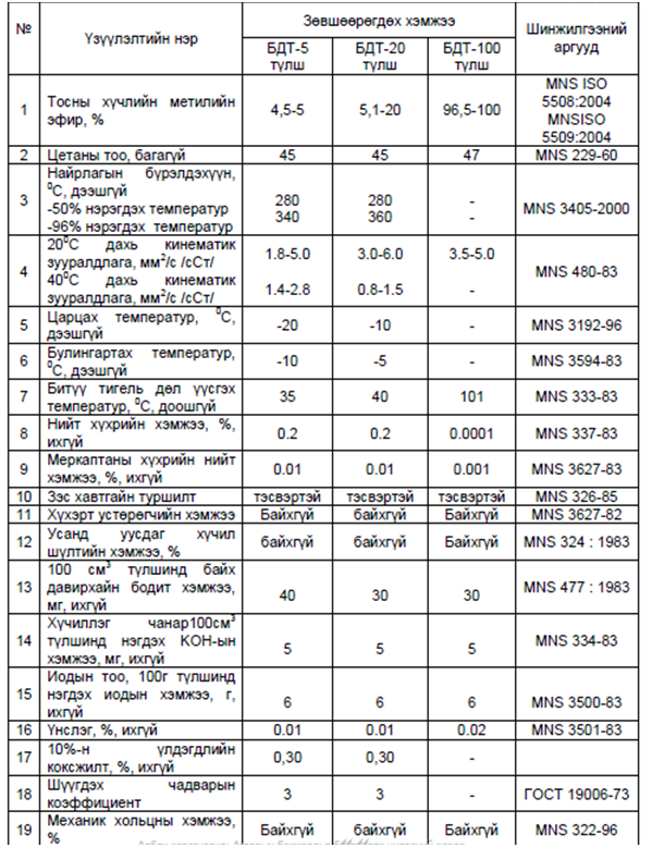4.4 Үйлдвэрлэгч, захиалагч, хэрэглэгч нар харилцан тохиролцсон нөхцөлд агууламж өндөртэй (түлшинд байх биодизель түлш 20%-50% хооронд) биодизель түлшийг нийлүүлж болно. Агууламж өндөртэй биодизель түлш нь БДТ-20 биодизель түлшний стандартын шаардлага хангасан байх ѐстой.