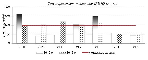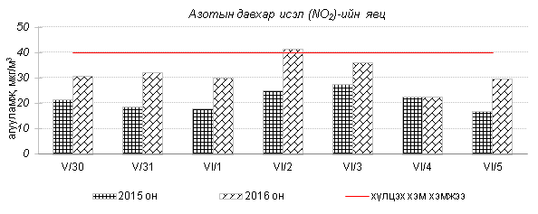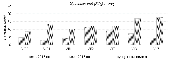 Улаанбаатар хотын агаарт түгээмэл бохирдуулах бодис хүхэрлэг хий /SO2/, азотын давхар исэл /NO2/, тоосонцор /PM10, PM2.5/, нүүрстөрөгчийн дутуу исэл /CO/, озон /O3/-ы агууламжийг тодорхойллоо.