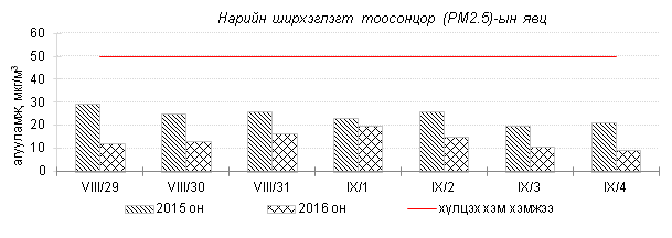 Өнгөрсөн 7 хоногийн агаарын чанарын хяналт шинжилгээний дүнгээр Улаанбаатар хотын төв автозам болон гэр хороолол орчимд агаар “Бага зэргийн бохирдолтой” бусад хэсэгт агаарын чанар “Хэвийн” түвшинд байна. Дэлгэрэнгүй мэдээг хавсралтаас үзнэ үү