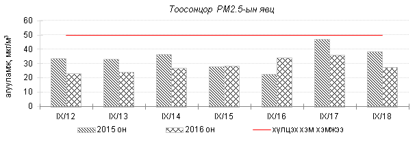 Улаанбаатар хотын агаарт түгээмэл бохирдуулах бодис хүхэрлэг хий /SO2/, азотын давхар исэл /NO2/, тоосонцор /PM10, PM2.5/, нүүрстөрөгчийн дутуу исэл /CO/, озон /O3/-ы агууламжийг тодорхойллоо.