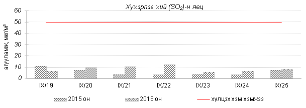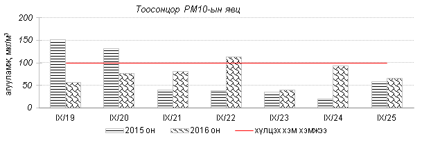 Улаанбаатар хотын агаарт түгээмэл бохирдуулах бодис хүхэрлэг хий /SO2/, азотын давхар исэл /NO2/, тоосонцор /PM10, PM2.5/, нүүрстөрөгчийн дутуу исэл /CO/, озон /O3/-ы агууламжийг тодорхойллоо.