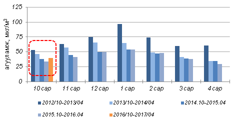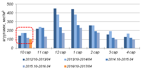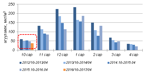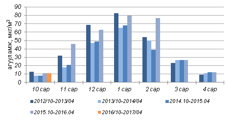 Зураг 4. Хүйтний улирлын хүхэрлэг хийн сарын дундаж агууламж, 2012-2016он