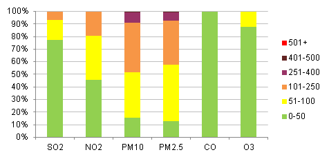 Улаанбаатар хотын агаарын чанарыг хянах зарим суурин харуулуудын 2016 оны 10 дугаар сарын дүнд индекс тооцон тухайн орчны агаарын чанарыг үнэлэхэд. 10 дугаар сард гэр хороололд буюу Толгойт орчимд 2 өдөр агаар их бохирдолтой, 10 өдөр агаар дунд зэргийн бохирдолтой, 16 өдөр агаар бага зэргийн бохирдолтой, 3 өдөр агаар хэвийн түвшин байсан бол томоохон автозамуудын орчимд буюу баруун 4 зам, 13-р хороолол орчимд сарын бүх өдөр агаар бага зэргийн бохирдолтой түвшинд байжээ. Харин Ургах наран хорооллын орчимд 1 өдөр агаар бага зэргийн бохирдолтой түвшинд бусад өдрүүдэд агаар хэвийн болон цэвэр түвшинд байсан байна (Зураг 5). Агаар дахь гол бохирдуулах бодисууд нь PM10 болон PM2.5 тоосонцор, азотын давхар исэл NO2, хүхэрлэг хий SO2 байлаа (Зураг 6).