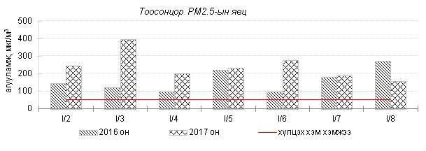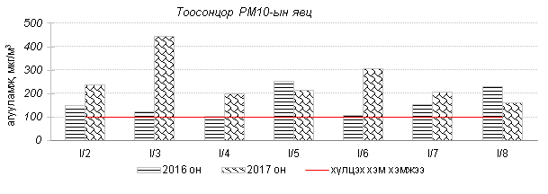 Өнгөрсөн 7 хоногийн агаарын чанарын хяналт шинжилгээний дүнгээр Улаанбаатар хотын хэмжээнд 2017.01.03-нд агаар “Маш их” бохирдолтой түвшинд бусад өдрүүдэд Толгойт, Зурагт, Баянхошуу зэрэг томоохон гэр хорооллын орчимд агаар “Маш их” бохирдолтой түвшинд байлаа. Улаанбаатар хотын бусад хэсэгт агаар “Дунд” болон “Бага” зэргийн бохидолтой түвшинд байсан байна. Агаар дахь гол бохирдуулах бодис нь PM10, PM2.5 тоосонцор байна. Дэлгэрэнгүй мэдээг хавсралтаас үзнэ үү.