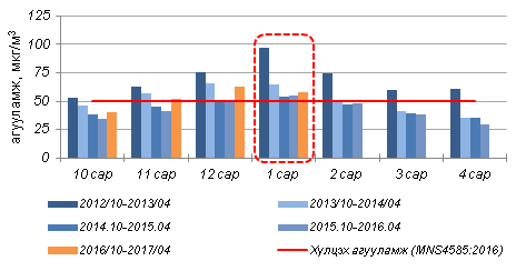 Зураг 4. Хүйтний улирлын хүхэрлэг хийн сарын дундаж агууламж, 2012-2017он