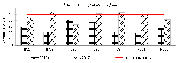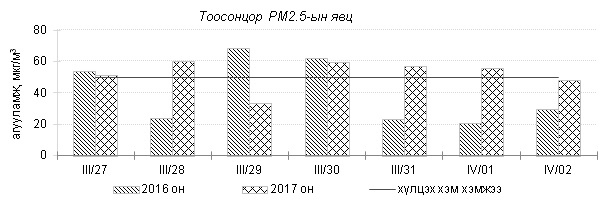 Өнгөрсөн 7 хоногийн агаарын чанарын хяналт шинжилгээний дүнгээр Улаанбаатар хотод агаар “Бага” зэргийн бохидолтой болон “Хэвийн” түвшинд байсан байна. Агаар дахь гол бохирдуулах бодис нь PM10, PM2.5 тоосонцор, NO2 азотын давхар исэл байна. Дэлгэрэнгүй мэдээллийг хавсралтаас үзнэ үү.