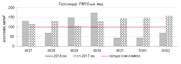 Улаанбаатар хотын агаарт түгээмэл бохирдуулах бодис хүхэрлэг хий /SO2/, азотын давхар исэл /NO2/, тоосонцор /PM10, PM2.5/, нүүрстөрөгчийн дутуу исэл /CO/, озон /O3/-ы агууламжийг тодорхойллоо.