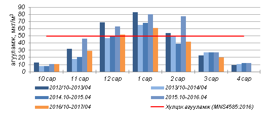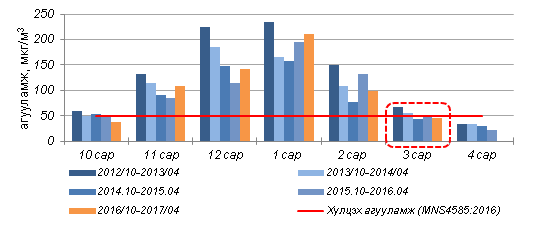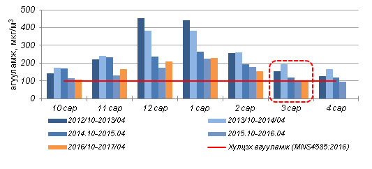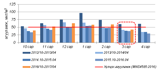 Агаарын чанарын суурин харуулуудын дүнгээр хүхэрлэг хийн 2017 оны 3-р сарын дундаж агууламж 20мкг/м3 хүрсэн бөгөөд өмнөх оны мөн үеэс 22%-аар бага байлаа (Зураг 4).