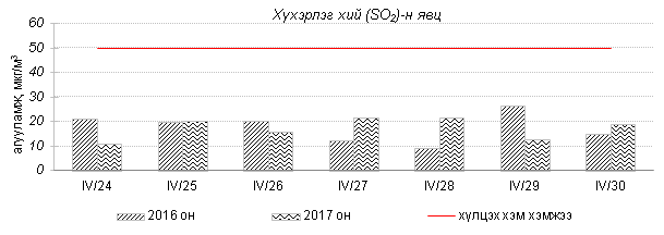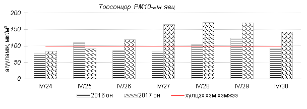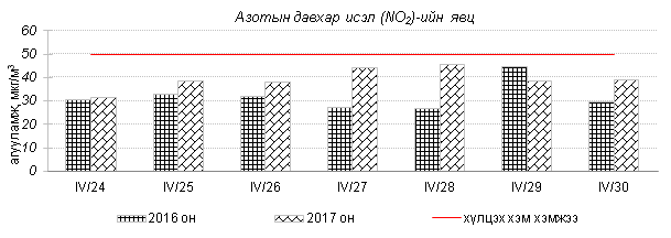 Улаанбаатар хотын агаарт түгээмэл бохирдуулах бодис хүхэрлэг хий /SO2/, азотын давхар исэл /NO2/, тоосонцор /PM10, PM2.5/, нүүрстөрөгчийн дутуу исэл /CO/, озон /O3/-ы агууламжийг тодорхойллоо.