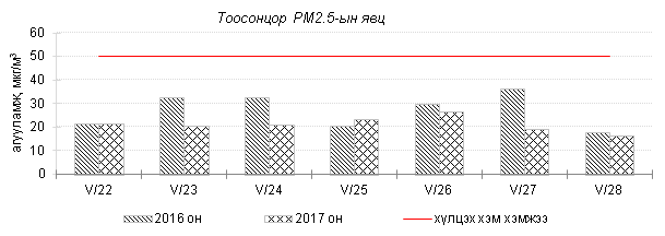 Улаанбаатар хотын агаарт түгээмэл бохирдуулах бодис хүхэрлэг хий /SO2/, азотын давхар исэл /NO2/, тоосонцор /PM10, PM2.5/, нүүрстөрөгчийн дутуу исэл /CO/, озон /O3/-ы агууламжийг тодорхойллоо.