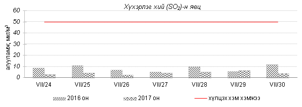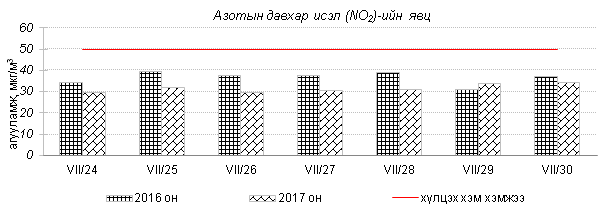 Өнгөрсөн 7 хоногийн агаарын чанарын хяналт шинжилгээний дүнгээр томоохон автозамуудын орчимд агаар “Бага” зэргийн бохидолтой бусад хэсэгт агаар “Хэвийн” болон “Цэвэр” түвшинд байсан байна. Агаар дахь гол бохирдуулах бодис нь NO2 азотын давхар исэл байна. Дэлгэрэнгүй мэдээг хавсралтаас үзнэ үү.