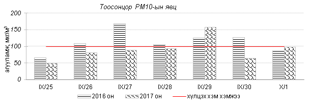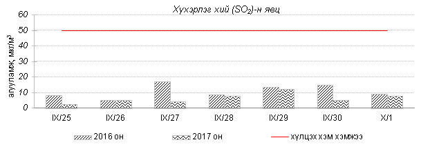 Улаанбаатар хотын агаарт түгээмэл бохирдуулах бодис хүхэрлэг хий /SO2/, азотын давхар исэл /NO2/, тоосонцор /PM10, PM2.5/, нүүрстөрөгчийн дутуу исэл /CO/, озон /O3/-ны агууламжийг тодорхойллоо.