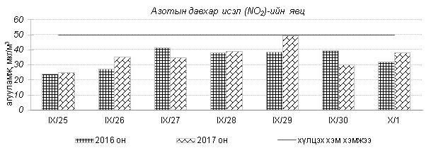 Өнгөрсөн 7 хоногийн агаарын чанарын хяналт шинжилгээний дүнгээр Улаанбаатар хотын хэмжээнд агаар “Хэвийн” болон “Бага” зэргийн бохирдолтой байна. Агаар дахь гол бохирдуулах бодис нь азотын давхар исэл (NO2), PM2.5, PM10 тоосонцор байна. Дэлгэрэнгүй мэдээг хавсралтаас үзнэ үү.