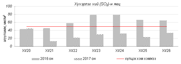 Улаанбаатар хотын агаарт түгээмэл бохирдуулах бодис хүхэрлэг хий /SO2/, азотын давхар исэл /NO2/, тоосонцор /PM10, PM2.5/, нүүрстөрөгчийн дутуу исэл /CO/, озон /O3/-ны агууламжийг тодорхойллоо.