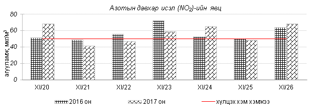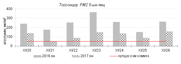 Өнгөрсөн 7 хоногийн агаарын чанарын хяналт шинжилгээний дүнгээр Улаанбаатар хотын хэмжээнд гэр хороолол орчим агаар “Дунд” зэргийн болон “Их” бохирдолтой түвшинд хүрсэн бол автозам, орон сууцны хороолол орчим агаар “Бага” зэргийн бохирдолтой байна. Агаар дахь гол бохирдуулах бодис нь PM2.5, PM10 тоосонцор, азотын давхар исэл (NO2) байна. Дэлгэрэнгүй мэдээг хавсралтаас үзнэ үү