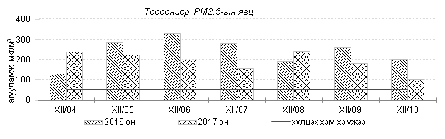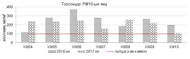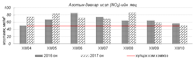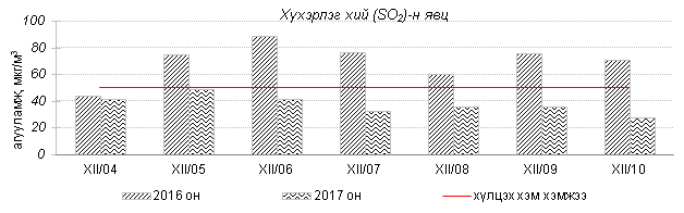 Өнгөрсөн 7 хоногийн агаарын чанарын хяналт шинжилгээний дүнгээр агаарын бохирдол гэр хороолол, төв автозамтай ойр орших Баянхошуу, Толгойт, Зурагт, Баруун 4 зам орчим хамгийн их илэрч 2016 оны мөн үетэй харьцуулахад агаар дахь SO2, PM2.5, PM10 тоосонцрын агууламж 2-28%-иар багассан боловч 24 цагийн дундаж агууламж агаарын чанарын стандартаас 1.6-7.6 дахин их байна. Дэлгэрэнгүй мэдээг хавсралтаас үзнэ үү.