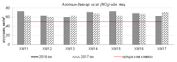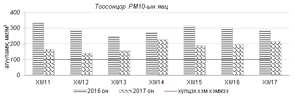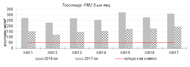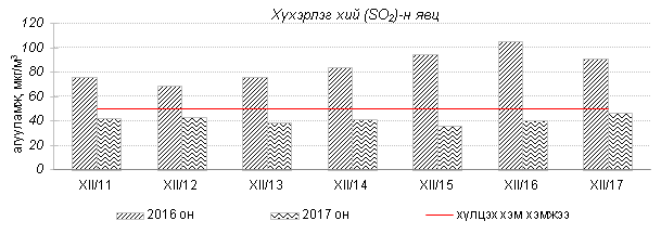 Өнгөрсөн 7 хоногийн агаарын чанарын хяналт шинжилгээний дүнгээр агаарын бохирдол гэр хороолол, төв автозамтай ойр орших Баянхошуу, Толгойт, Зурагт, Баруун 4 зам орчим хамгийн их байсан ба 2016 оны мөн үетэй харьцуулахад агаар дахь SO2, PM2.5, PM10 тоосонцрын агууламж 37-52%-иар бага, харин 24 цагийн дундаж агууламж агаарын чанарын стандартаас 2.1-5.0 дахин их байна. Дэлгэрэнгүй мэдээг хавсралтаас үзнэ үү.