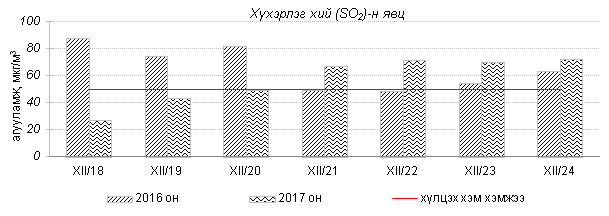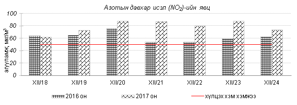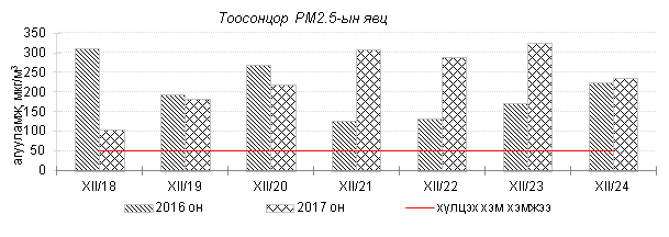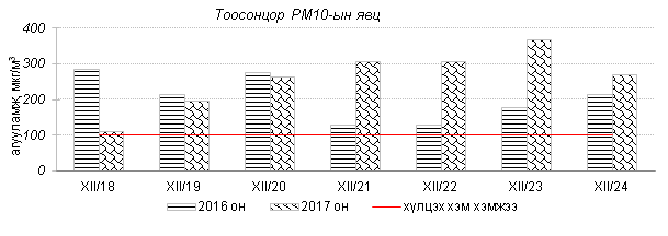Өнгөрсөн 7 хоногийн агаарын чанарын хяналт шинжилгээний дүнгээр агаарын чанар Улаанбаатар хотын хэмжээнд ихэнх өдрүүдэд “Дунд” болон “Их” бохирдолтой, гэр хороолол орчим “Маш их” бохирдолтой түвшинд хүрч 2016 оны мөн үетэй харьцуулахад агаар дахь PM10, PM2.5 тоосонцрын агууламж 16-27%-иар их, 24 цагийн дундаж агууламжийн хамгийн их нь агаарын чанарын стандартаас 7-13 дахин их байна. Дэлгэрэнгүй мэдээг хавсралтаас үзнэ үү.