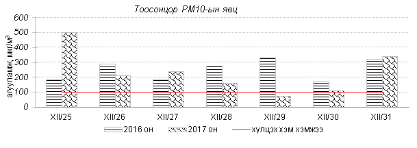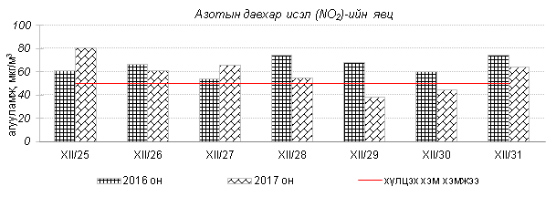 Өнгөрсөн 7 хоногийн агаарын чанарын хяналт шинжилгээний дүнгээр агаарын чанар Улаанбаатар хотын хэмжээнд ихэнх өдрүүдэд “Дунд” болон “Их” бохирдолтой, гэр хороолол орчим “Маш их” бохирдолтой түвшинд хүрч 2016 оны мөн үетэй харьцуулахад агаар дахь SO2, NO2, PM10, PM2.5 тоосонцрын агууламж 8-49%-иар бага, 24 цагийн дундаж агууламжийн хамгийн их нь агаарын чанарын стандартаас 3-14 дахин их байна.   Дэлгэрэнгүй мэдээг хавсралтаас үзнэ үү.