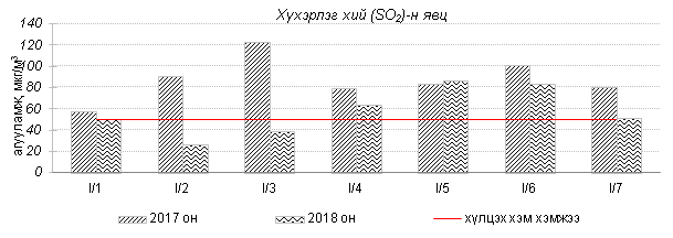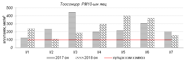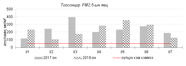 Өнгөрсөн 7 хоногийн агаарын чанарын хяналт шинжилгээний дүнгээр агаарын чанар Улаанбаатар хотын хэмжээнд ихэнх өдрүүдэд “Дунд” болон “Их” бохирдолтой, гэр хороолол орчим “Маш их” бохирдолтой түвшинд хүрч 2017 оны мөн үетэй харьцуулахад агаар дахь PM10 тоосонцрын агууламж 2.8%-иар их, PM2.5 тоосонцор, хүхэрлэг хийн агууламж 4-35%-иар бага, 24 цагийн дундаж агууламжийн хамгийн их нь агаарын чанарын стандартаас 2-16 дахин их байна. Дэлгэрэнгүй мэдээг хавсралтаас үзнэ үү.